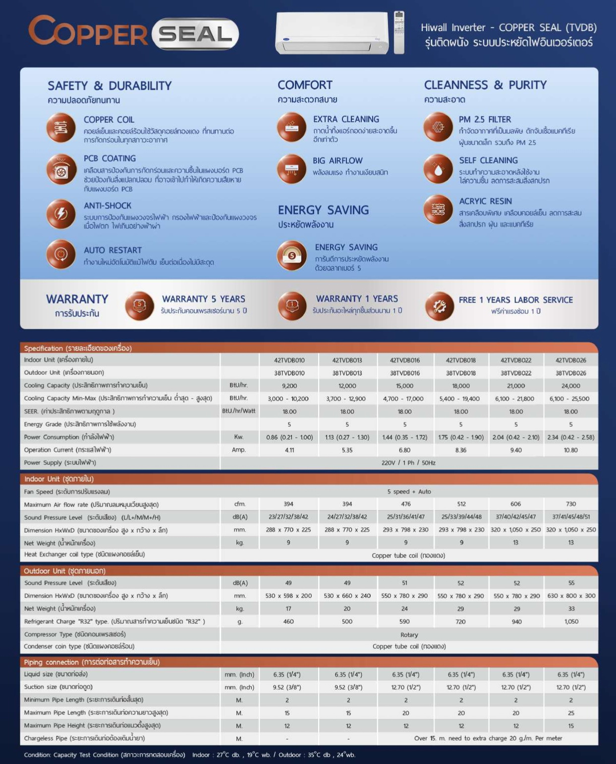38TVDB018 / 42TVDB018 CARRIER COPPER SEAL (COPPER 10 เดิม) Hi-wall Inverter แอร์แคเรียร์ ติดผนัง ระบบอินเวอร์เตอร์ น้ำยา R32 18000 BTU. พร้อมบริการติดตั้ง